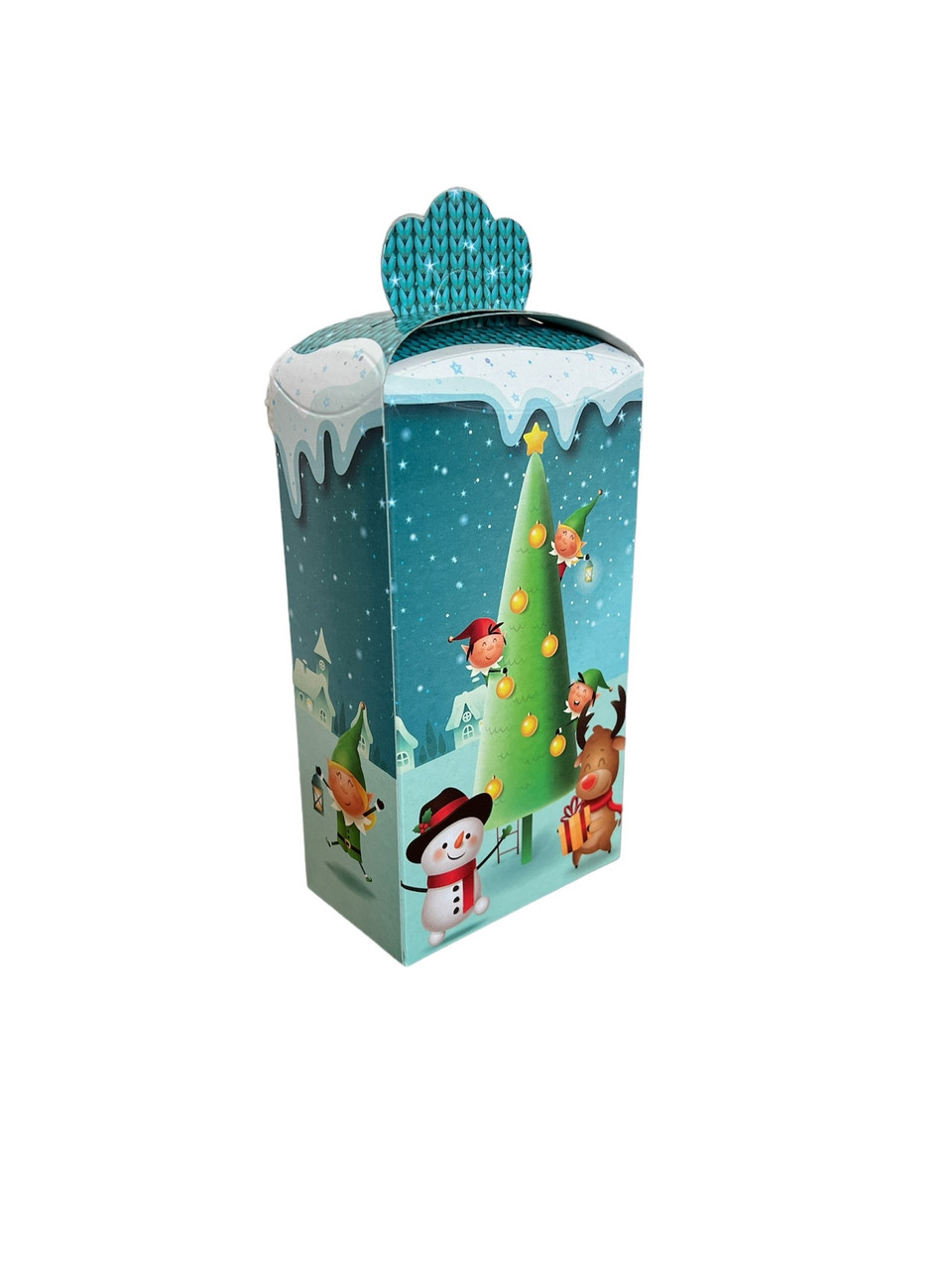 Новорічна картонна коробка на цукерки до 500 г. Розмір: висота (без ручки) 18 см, довжина 10 см, ширина 6 см. Якісний картон і яскравий глянсовий малюнок На фото коробка з двох сторін