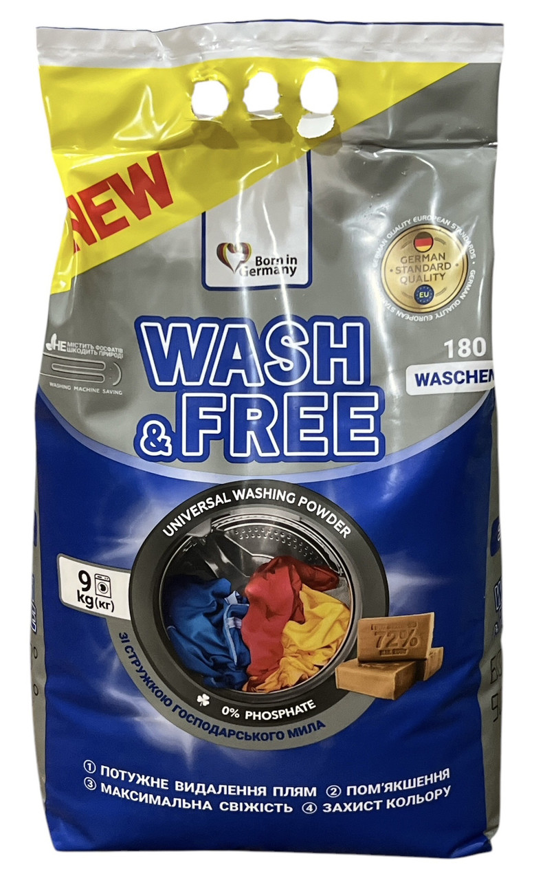 Пральний порошок WASH&FREE підходить для автоматичного та ручного прання. Спеціально розроблена формула засобу забезпечує ідеальне прання білих, кольорових і темних тканин. Засіб діє м'яко та комплексно. Марсельське мило очищає тканину від широкого спектра забруднень, не залишаючи слідів на одязі.